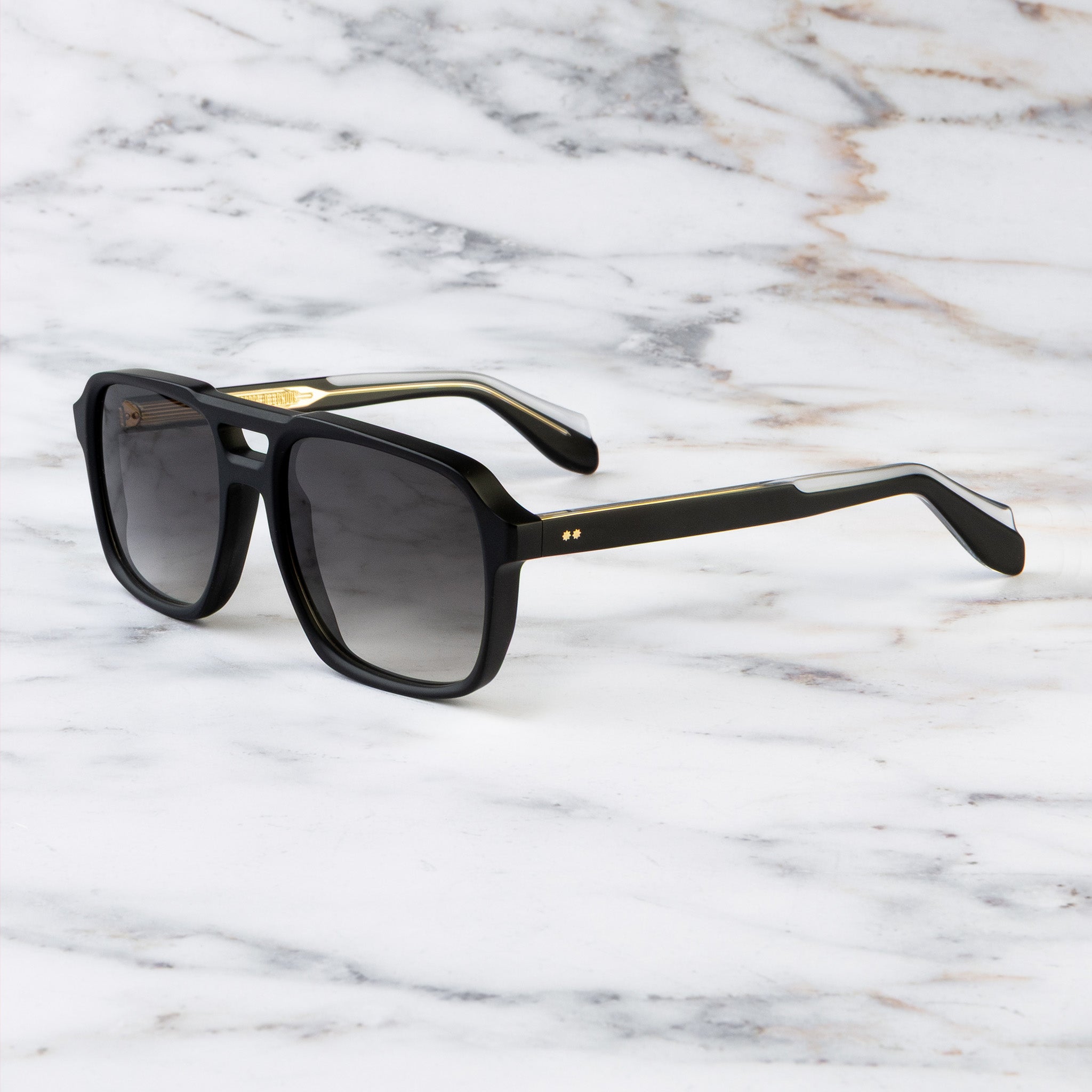 An archive aviator Cutler and Gross frame from the 1970s laid the foundations for the 1394 sunglass. It is handcrafted from acetate to a distinguished profile with squared lenses and a double bridge, with polished Compass Star pins to detail the temples.